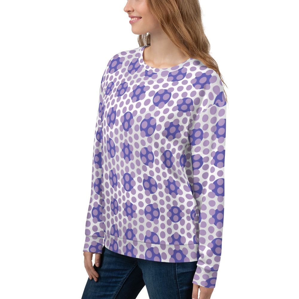 Women’s sweatshirt featuring playful circles and polka-dot print in cheerful east side violet. Soft, cozy interior and an easy, flattering fit for everyday wear. Made from recycled materials for sustainable style and comfort.